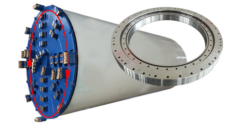 頂管機(jī)主要由旋轉(zhuǎn)挖掘系統(tǒng)、主頂液壓推進(jìn)系統(tǒng)、泥土輸送系統(tǒng)、注漿系統(tǒng)、測(cè)量設(shè)備、地面吊裝設(shè)備和電氣系統(tǒng)等組成。我公司生產(chǎn)的頂管機(jī)專用三排圓柱滾子轉(zhuǎn)盤軸承(回轉(zhuǎn)支承)用于旋轉(zhuǎn)挖掘系統(tǒng)中的切削刀盤。